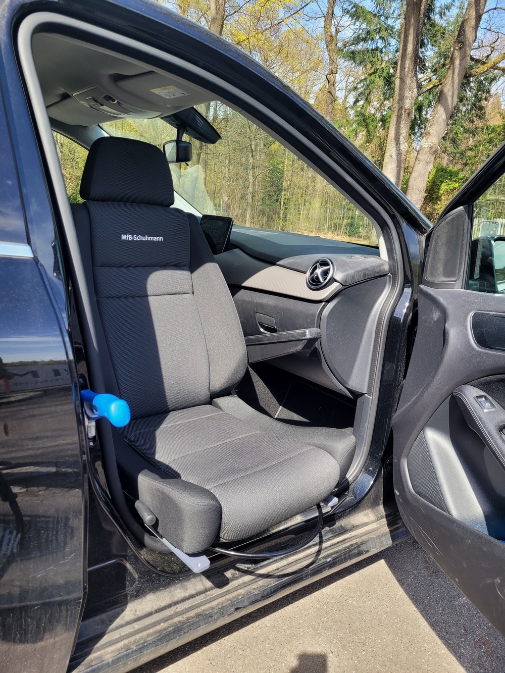 2022 hatten wir uns dann zu einem Umbau entschieden, da habe ich unter der Woche noch regelmäßig Tage bei meiner Mutter verbracht. Ich hatte im Internet nach Firmen in der Nähe gesucht, die solche Umbauten machen. Das ist gar nicht so einfach, Kfz Umrüster gibt es nicht an jeder Ecke, wir hatten aber eine Firma zwischen Pforzheim und Karlsruhe gefunden. Dort sind wir hingefahren, um uns vor Ort zu erkundigen. Nach einer kurzen Beratung war sofort klar was ich brauche. Wir hatten uns die Funktionsweise von Schwenksitzen angesehen, das war die Lösung. Nachdem wir uns dafür entschieden haben ging es richtig schnell. Innerhalb von einer Woche war das Auto fertig, inklusive Gutachten und TÜV Abnahme, die Eintragung in die Kfz Papiere hatten wir bei der Zulassungsstelle selbst gemacht. Der Kfz Umrüster hatte alles vorbereitet, die Firma macht auch nichts anderes, als Kfz Umbauten. Die hatten sogar das Auto bei uns abgeholt, und nach dem Umbau wieder gebracht.
