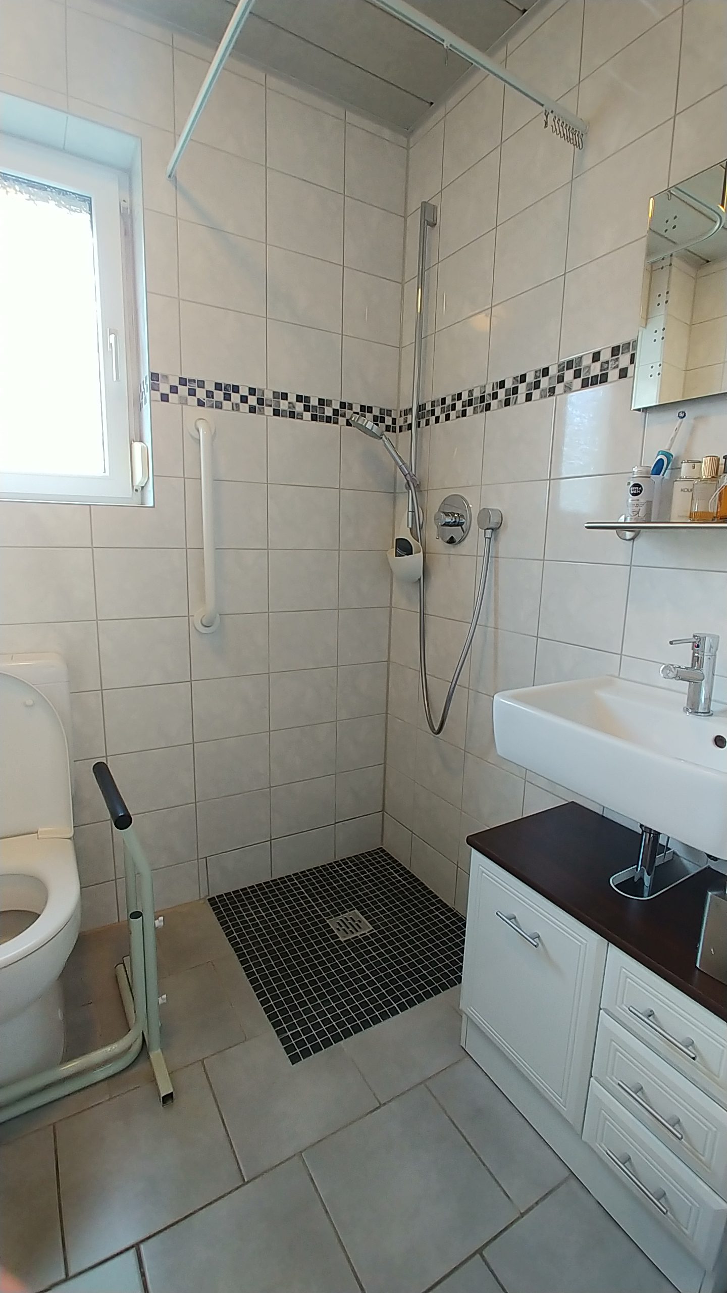 Seit 2019 habe ich eine neue Dusche, barrierefrei mit Haltemöglichkeit. Das hätte ich schon damals beim Umzug in die Erdgeschosswohnung machen lassen sollen, aber wer hätte das geahnt. Jetzt muss ich nicht mehr in die Duschwanne steigen, nun ist alles ebenerdig. Und ich habe mehr Platz im Bad.